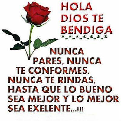 | Hola Dios te bendiga, nunca pares, nunca te conformes, nunca te rindas, hasta que lo bueno sea mejor y lo mejor sea excelente. |