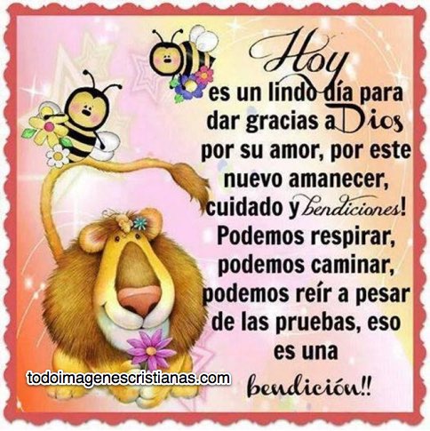 | Hoy es un lindo día para dar gracias a Dios por su amor, por este nuevo amanecer, cuidado y bendiciones! podemos respirar, podemos caminar, podemos reír a pesar de las pruebas, eso es una bendición. |